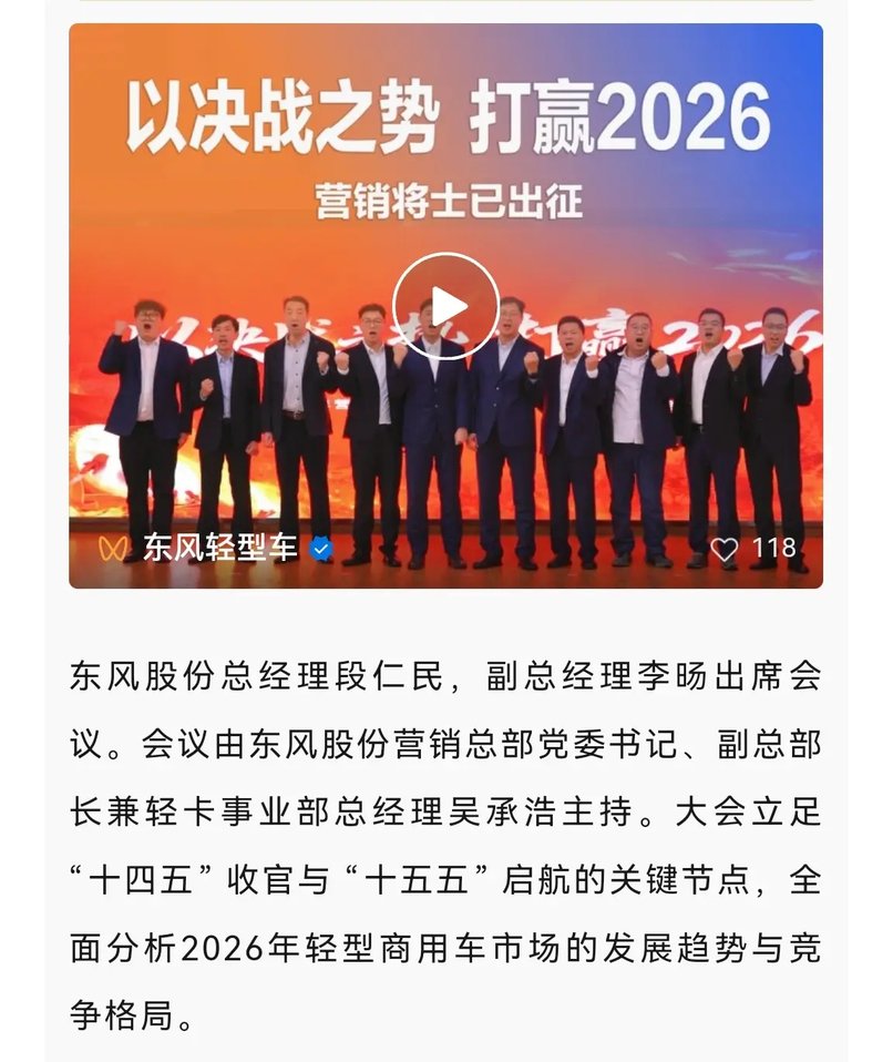 根据东风轻型车1月4日晚间推文,东风汽车股份有限公司召开了2026年营销工作启动会暨营销将士出征誓师大会,东风股份总经理段仁民,副总经理李旸出席会议。这显示李旸已经从神龙汽车回归东风股份,并出任东风汽车股份有限公司副总经理。