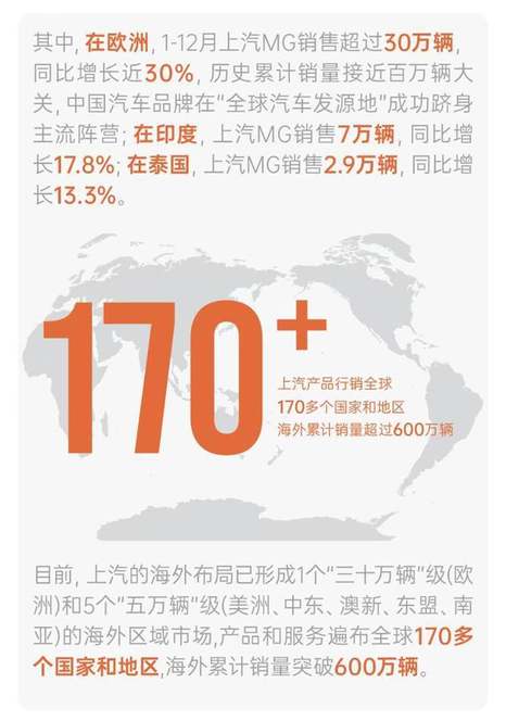 目前,上汽在海外市场已构建起 “1+5” 全球化战略版图,以欧洲为代表的1个“三十万辆”级为头部市场,以美洲、中东、澳新、东盟、南亚在内的5个“五万辆”级市场为主力市场的布局,上汽的产品和服务已遍布全球170多个国家和地区,稳步深耕海外市场。