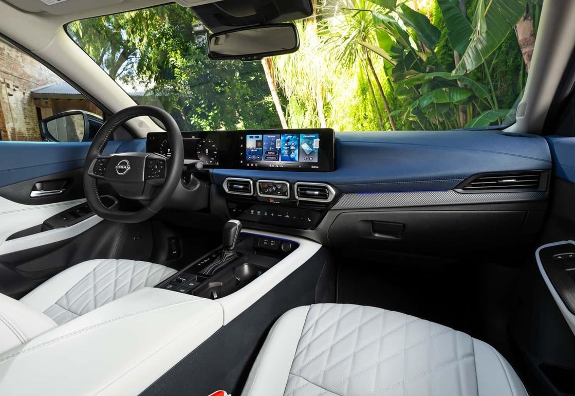 另据细节图来看,内饰将延续海外版的双联屏布局。参考来看,更为简洁的环抱式座舱内配备双12.3英寸一体式联屏,国产版还有望采用高通8155芯片,下方配备三个矩形空调出风口以及物理按键,另外还将采用全新双辐式多功能方向盘和电子挡把,而全新座椅继承了“日产大沙发”特性。