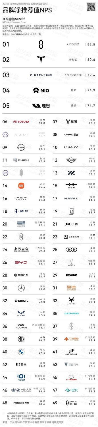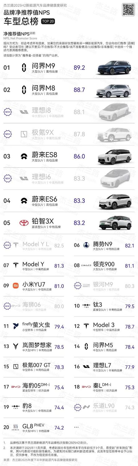 近日,杰兰路咨询发布《2025下半年新能源汽车品牌健康研究报告》。报告显示,问界荣获品牌NPS(净推荐值)第一、品牌发展信心指数第一、30万元以上品牌百人青睐指数第一;问界旗下“双旗舰王牌”,再添口碑佳绩:全景智慧旗舰SUV问界M9荣获车型NPS (净推荐值) 第一,家庭智慧旗舰SUV问界M8首次参评即荣获NPS (净推荐值) 第二。这一系列亮眼成绩,无不彰显问界在高端新能源赛道的引领地位。
