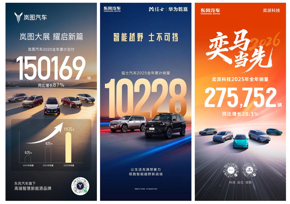 在产品端,核心技术的应用让东风汽车产品形成了鲜明的差异化优势。岚图、猛士、奕派等品牌的市场表现,印证了技术对产品力的提升作用。岚图汽车2025年累计交付150,169辆,同比增长87%,夯实了“央国企高端新能源第一品牌”的地位;猛士汽车全年销量达10,228辆,同比增长387%,填补了中国豪华电动越野市场空白;奕派科技全年销量275,752辆,同比增长28.3%,月销连续突破三万,成为主流市场核心力量。这些成绩的背后,正是马赫动力、智能生态等技术成果的强力支撑。