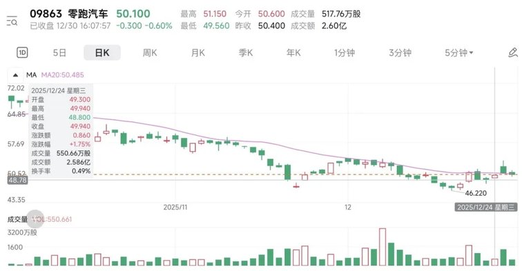 但中国一汽入股后两个交易日,零跑汽车股价分别微涨0.92%和下跌0.6%,截至12月30日收盘报收50.1港元,总市值712亿港元,并未如预期中迎来大涨。较之前直逼千亿大关仍有较大差距。