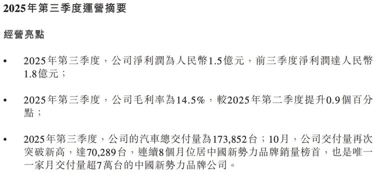 2025年第三季度,零跑汽车实现营收194.5亿元,同比增长97.3%;单季度净利润为1.5亿元,前三季度净利润1.8亿元,刚刚迈过盈亏平衡线。
