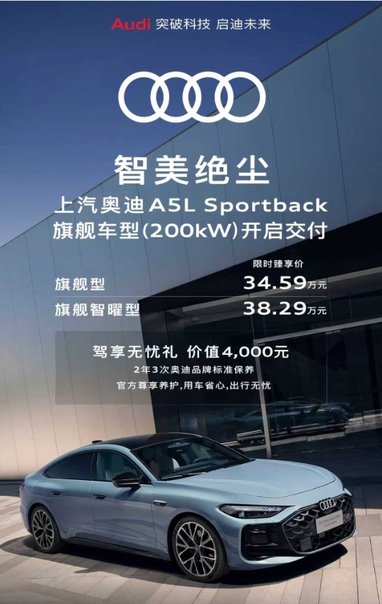 本次交付的上汽奥迪A5L Sportback旗舰车型共推出两款配置,其中“旗舰型”限时臻享价34.59万元,“旗舰智曜型”限时臻享价38.29万元。为回应用户期待,购车即可尊享价值4,000元的“驾享无忧礼”,包含2年3次奥迪品牌标准保养服务,以体系化专业养护保障用车全程品质。
