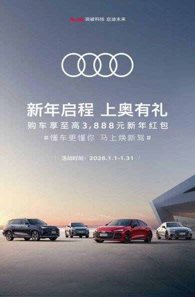 2026年1月6日,上海 – 全新上汽奥迪A5L Sportback旗舰车型(200kW)已全面开启交付。值此新年到来之际,上汽集团正式启动“懂车更懂你,马上焕新驾——2026上汽新春欢乐购”。上汽奥迪同步推出新年购车礼遇:即日起至1月31日,购买全新上汽奥迪A5L Sportback、上汽奥迪A7L、上汽奥迪Q6或上汽奥迪Q5 e-tron任意车型,可享至高3,888元新年红包,助力用户轻松开启安心无忧的豪华出行新程。