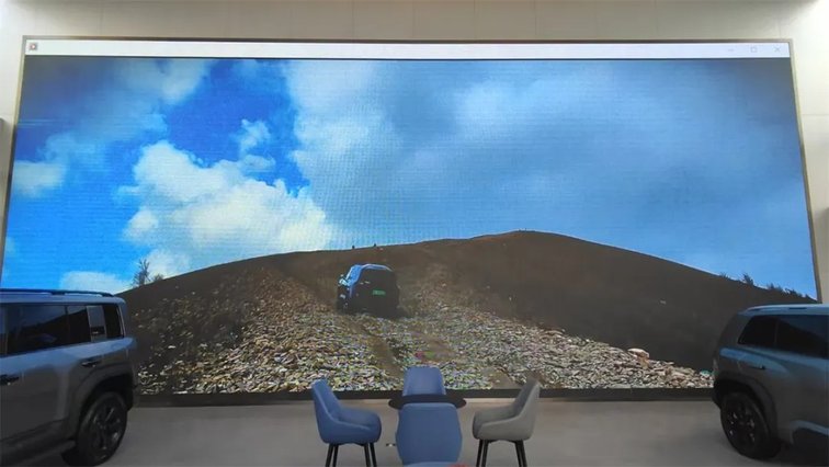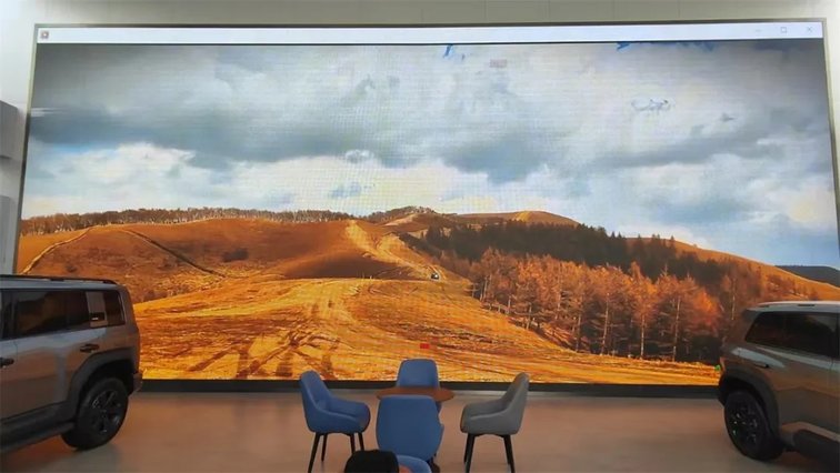 在4S店大堂进门正对着的巨型投影幕上,一直在循环播放方程豹车队在户外越野的各种视频片段,动感激昂的背景音乐与绚丽多彩的越野山水,让每一位路过的顾客都忍不住驻足欣赏。