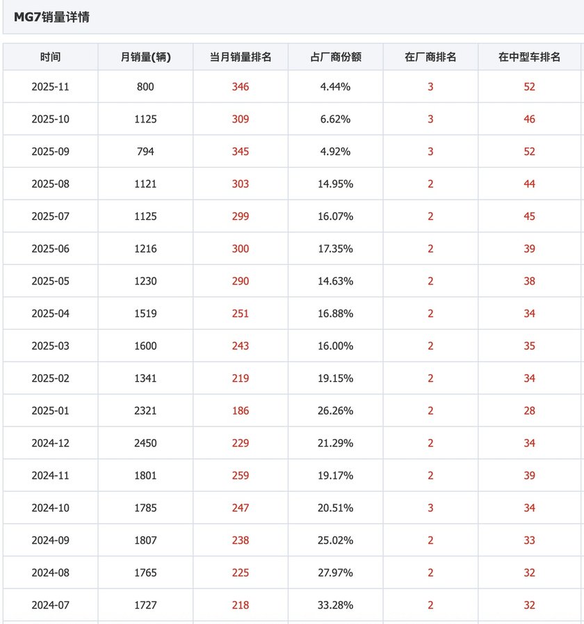 从2010年开始,MG7销量急剧下滑,进入长达十余年的低迷期。多数月份销量仅为两位数甚至个位数,最低时月销仅1辆(2015年6月)。这一时期,MG7在品牌内部份额骤降至不足1%,中型车排名也跌至30名开外,基本处于市场边缘位置。