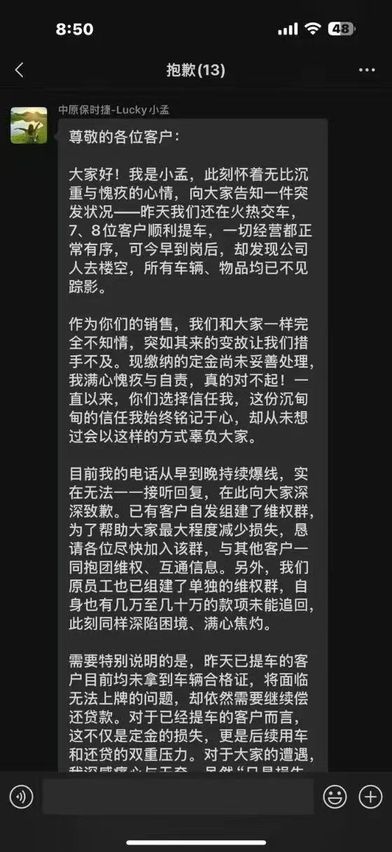 而提前通知还是体面的做法。12月23日,多位用户在社交平台发文,“郑州中原保时捷中心突然闭店,车辆几乎被清空”。而根据网传信息,一份由销售发送给客户的《致客户书》显示:直到12月22日,门店仍处于正常经营状态,当天还有几位客户顺利提车。12月23日早晨到岗后,员工才发现公司人去楼空,员工事前同样毫不知情。部分客户已缴纳的定金尚未得到妥善处理,而员工自身也存在数万元至数十万元不等的薪资和报销款项被拖欠的情况。