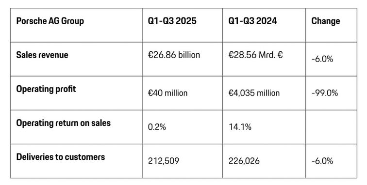 数据显示,2025年前三季度,保时捷销售收入268.6亿欧元,同比下降 6%;营业利润仅为4000万欧元,较去年同期的40.35亿欧元断崖式下跌99%。其中三季度更是出现了9.66亿欧元的单季度亏损;销售回报率从去年同期的14.1%暴跌至0.2%,近乎归零。