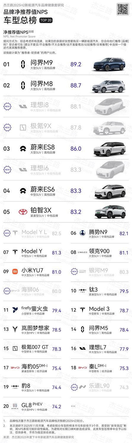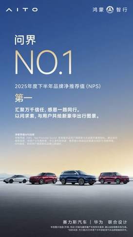 近日,杰兰路发布《2025年度下半年新能源汽车品牌健康度研究》报告。报告显示,问界荣获品牌NPS(净推荐值)第一、品牌发展信心指数第一、30万元以上品牌百人青睐指数第一;其中全景智慧旗舰SUV问界M9以89.2的分数位列NPS(净推荐值)车型总榜第一,这是问界M9继2024年全年、2025上半年后第四次摘冠,也成为新能源SUV车型中第一个、唯一一个连续四次获得NPS第一的车型。这一成绩不仅印证了用户对其全维实力的深度认可,更展现了问界M9在50万级豪华SUV市场的强大号召力。