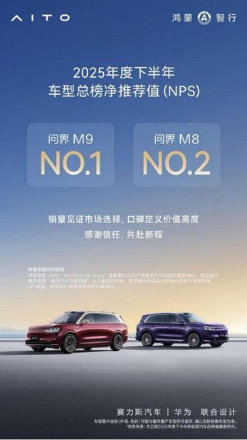近日,杰兰路发布《2025年度下半年新能源汽车品牌健康度研究》报告。作为衡量用户推荐意愿的重要指标,品牌净推荐值(NPS)车型总榜备受关注。榜单显示,问界“双旗舰王牌”再添佳绩:全景智慧旗舰SUV问界M9位居车型NPS(净推荐值)第一,家庭智慧旗舰SUV问界M8首次参评即位居NPS(净推荐值)第二。该结果进一步印证了问界在高端新能源市场的用户口碑表现。