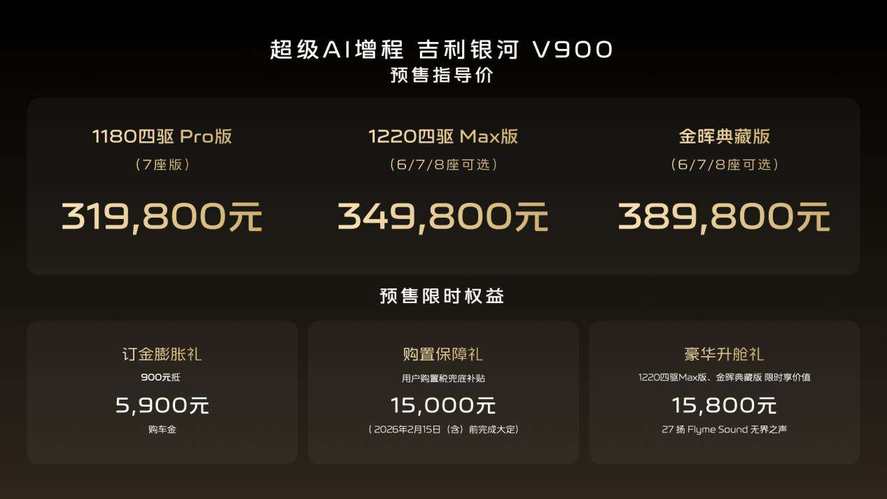 1月7日,吉利银河旗下V系列的首发之作,“AI全场景家庭旗舰MPV”——吉利银河V900正式开启预售,共计3个版本,预售指导价格区间为31.98万元~38.98万元。新车围绕中国大家庭出行的真实需求,以宽奢空间、豪华驾控、全维安全、AI智能几大全能满配实力,重新定义豪华旗舰MPV价值标准,树立AI全场景豪华出行新高度。
