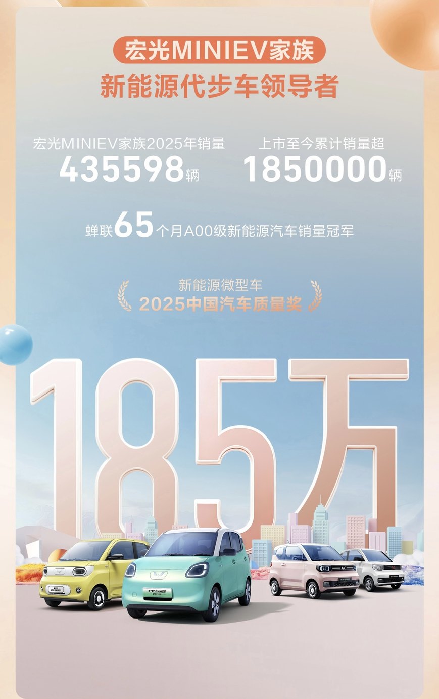 宏光MINIEV家族2025年热销435598辆,累计破185万稳居销冠