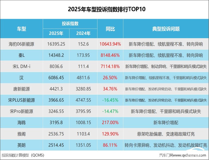 汽车质量投诉点评:2025年,海豹06新能源的投诉指数高达16395.25,同比暴涨106倍。这背后,新车降价增配贡献了大部分投诉量。数据显示:该问题投诉指数达到了13773.5,占比高达84%。海豹06新能源上市不到一年,官方便推出了智驾版新车型,且新款在同等价格下配置显著提升,引发了大量老车主的不满,迅速推高了海豹06新能源的投诉。此外,续航里程不准和转向异响的问题也饱受车主诟病。