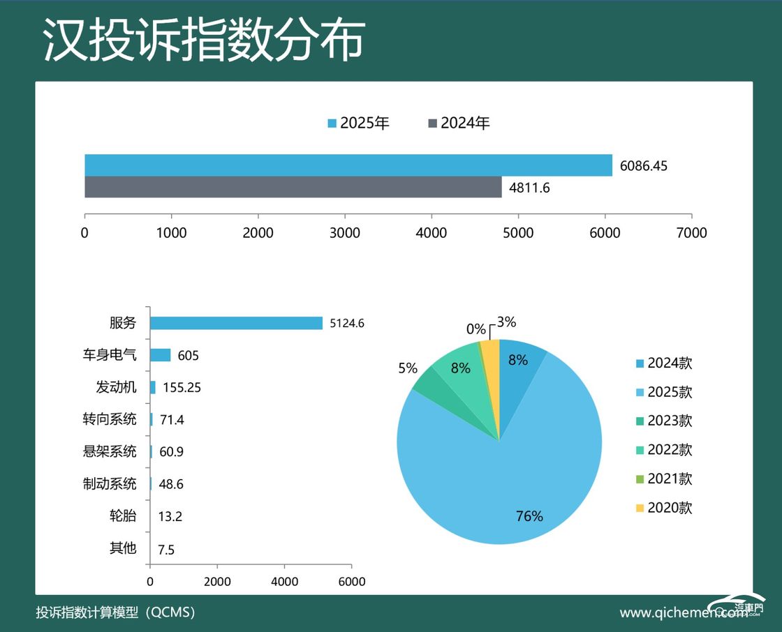 汽车质量投诉点评:过去的一年,比亚迪汉的投诉指数达到了6086.45,同比上涨了26.5%。去年春节过后,比亚迪发布了多款搭载高阶智驾的新车,比亚迪汉也在其中,因此新车降价增配也是其投诉焦点。除此之外,续航里程不准、千里眼和哨兵模式缺失等问题也引起了车主的不满,但整体投诉量并不高。从反馈来看,二者投诉指数合计仅占比5%。