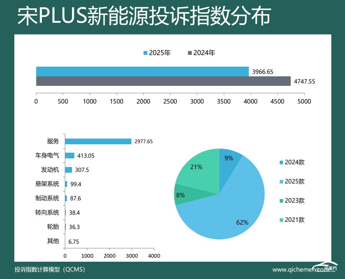 汽车质量投诉点评:2025年,宋PLUS新能源的投诉指数为3966.65,同比下滑了16.45%。其也存在和唐新能源一样的问题。有车主投诉称,因为油箱高低压问题,比亚迪官方在升级系统时,加入强制启动发动机的程序,在车主不知情的情况下启动发动机。该车主称该情况已经持续了一年多,使用强制用电模式也无法关闭发动机。