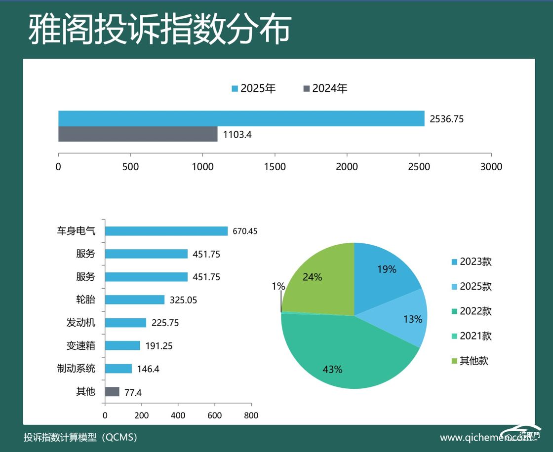 汽车质量投诉点评:过去一年,秦L的投诉指数达到了14348.2,同比涨超81倍,新车降价增配成为车主投诉的主要原因。去年2月,比亚迪向市场投放搭载了“天神之眼”智驾系统的新款秦L,且价格和老款车不变。老款车因硬件受限无法升级,二手车残值大幅缩水,引起了老车主的不满。他们认为,自身的权益受到了严重侵害。此外,续航里程不准也是秦L的典型投诉问题。车主普遍反映,官方宣称秦L满油满电续航2100km,但实际续航却在1100km-1500km之间,存在虚假宣传情况。转向异响也有部分车主投诉,他们表示车辆在转向打死往回时有“咯噔”声。