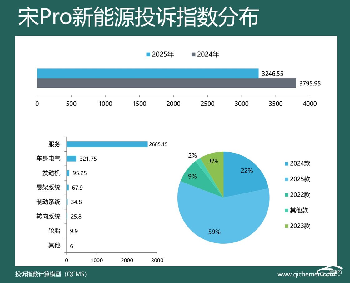 汽车质量投诉点评:2025年,宋Pro新能源的投诉指数同比下滑了14.47%。具体来看,2025年春节过后的那次降价增配同样波及到了宋Pro新能源,不过随着时间的流逝,这场风波已经基本平息。除此之外,千里眼和哨兵模式的缺失也一直困扰着车主们。从投诉反馈来看,问题主要存在2022款和2023款车型上,少部分涉及到2024款和2025款。