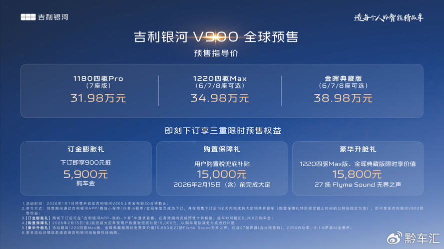 1月7日,吉利银河旗下V系列的首发之作,“AI全场景家庭旗舰MPV”——吉利银河V900正式开启预售,共计3个版本,预售指导价格区间为31.98万元~38.98万元。新车围绕中国大家庭出行的真实需求,以宽奢空间、豪华驾控、全维安全、AI智能几大全能满配实力,重新定义豪华旗舰MPV价值标准,树立AI全场景豪华出行新高度。