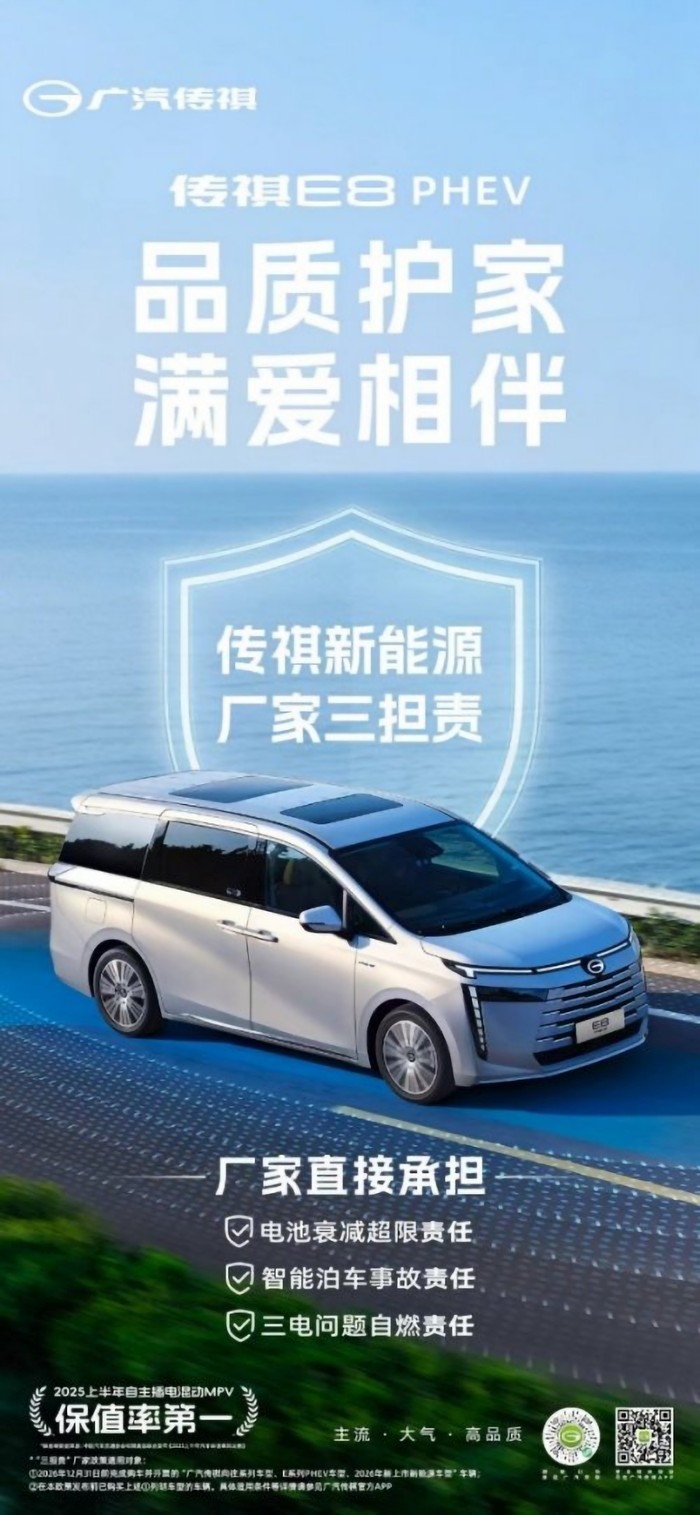 还有一个多月,马年新春的脚步就越来越近了。收拾行囊、规划路线,每一份对团圆的期待里,都藏着对出行安全的牵挂:长途奔波,车辆是否足够可靠?电池续航能否经得起考验?智能驾驶万一出状况该怎么办?买车,从来都不只是选一台代步工具,更是为全家的安危与舒心选择一份坚实托付。超9万家庭用信赖给出了答案——传祺 E8,这款连续17个月蝉联中型MPV销量冠军、斩获2025年中国质量协会用户满意度第一、2025上半年插混MPV保值率榜首的“中国家用车超优选”,岁末之际,它以厂家三担责承诺和一次重要的OTA升级,为全家扫清出行顾虑,为每一段团圆路注入满满安心。