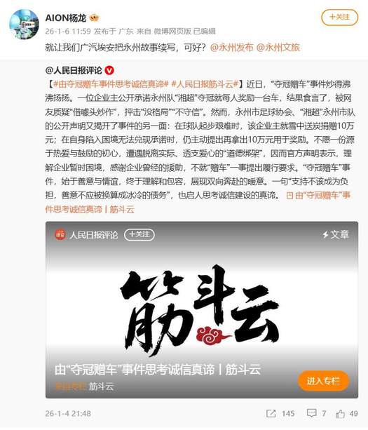 网友纷纷为这一主动接力的姿态点赞,并对“续写”的具体形式展开想象:有人认为可能会延续“送车”承诺,毕竟这是汽车企业的天然优势;也有人推测或将通过赞助等形式支持球队发展,这与埃安长期投入体育事业的形象相符;亦有人期待为球员提供更具意义的成长支持。尽管形式尚未明确,但公众普遍认为埃安的善意接力,或将给故事一个合家欢结局。