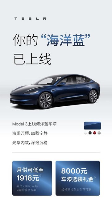 而除了以上的金融方案外,特斯拉还为Model Y升级了16英寸2K分辨率中控屏,但并没有调整售价,相当于“变相降价”了。同时Model 3新增了“海洋蓝”车漆,采用多色珠光粉,能在不同光照条件下呈现多样视觉效果,选装价格是8000元。通过车主引荐计划,消费者还可获得8000元车漆选装礼金,相当于免费选配新颜色。