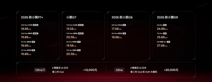 《车尚时刻》新媒体获悉,1月8日,在2026小鹏全球新品发布会上,小鹏汽车正式发布2026 款小鹏 P7+、小鹏 G7 超级增程、2026 款小鹏 G6、2026 款小鹏 G9。其中2026款小鹏P7+ 全球36国同步发布,新车有超级增程和纯电两种能源形式,超级增程有1550 Max 科技版和1550 Max 旗舰版,官方指导售价为18.68万元和19.88万元;纯电有615 Max旗舰版和725 Max 旗舰版,官方指导售价为18.68万元和19.88万元。2026款小鹏G7推出四个版本,超级增程1704 Max 科技版和1704 Max 旗舰版,官方指导售价为19.58万元和20.58万元;纯电602 Max 旗舰版和702 Max 旗舰版,官方指导售价为19.58万元和20.58万元。2026 款小鹏 G6推出纯电625 Max 科技版和625 Max 旗舰版,官方指导售价为17.68万元和18.68万元。2026 款小鹏 G9推出纯电625Max、725 Max和680 四驱Max版,官方指导售价为24.88万元、25.88万元和27.88万元。