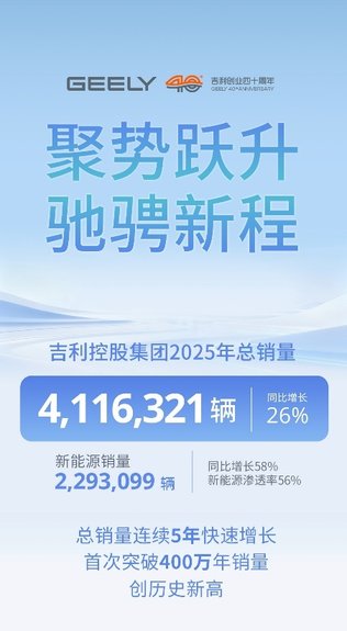 吉利控股2025年总销量411.6万辆 新能源占比过半