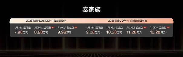 此次上市的两款新车形成精准定位梯度,既满足务实家庭的性价比追求,也兼顾品质家庭的进阶需求。2026款秦PLUS DM-i 210KM长续航版以8.98-9.98万元的定价,成为首款将200KM级纯电续航带入8万级市场的插混车型,堪称年轻家庭的“超值之选”;2026款秦L DM-i 210KM长续航版则推出11.28-12.28万元限时超级优享价,凭借全面升级的豪华配置,成为追求品质出行家庭的“进阶之选”。