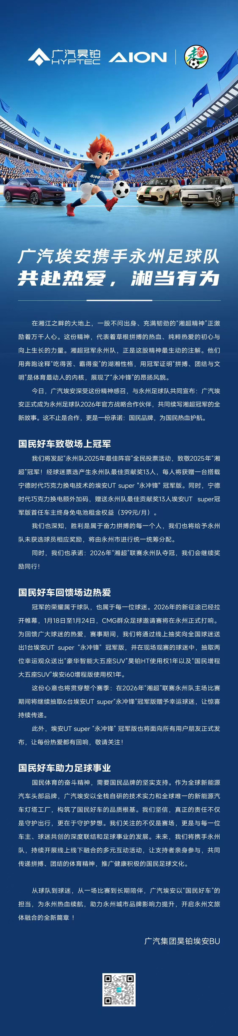 广汽埃安成湖南永州足球队2026战略合作伙伴,赠送超20台车及奖励