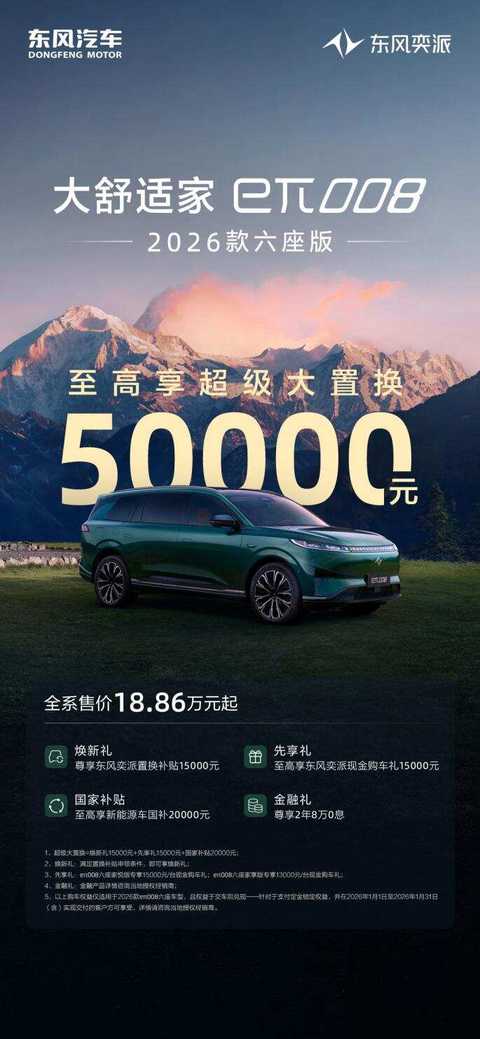 新年启新程,好礼伴你行。作为央企新能源品牌,东风奕派旗下主力车型在各自细分市场均展现出强劲竞争力。2026年开局之际,品牌推出的购车福利覆盖旗下全部主力车型,从购车补贴到金融支持,再到用车保障,全方位满足不同用户群体的购车需求。未来,东风奕派将继续坚守安全、驾控、智能、品质四大技术护城河,以更丰富的产品矩阵、更贴心的服务与更实在的福利,带着对科技的热忱与对用户的赤诚,与用户共赴更加精彩的未来。