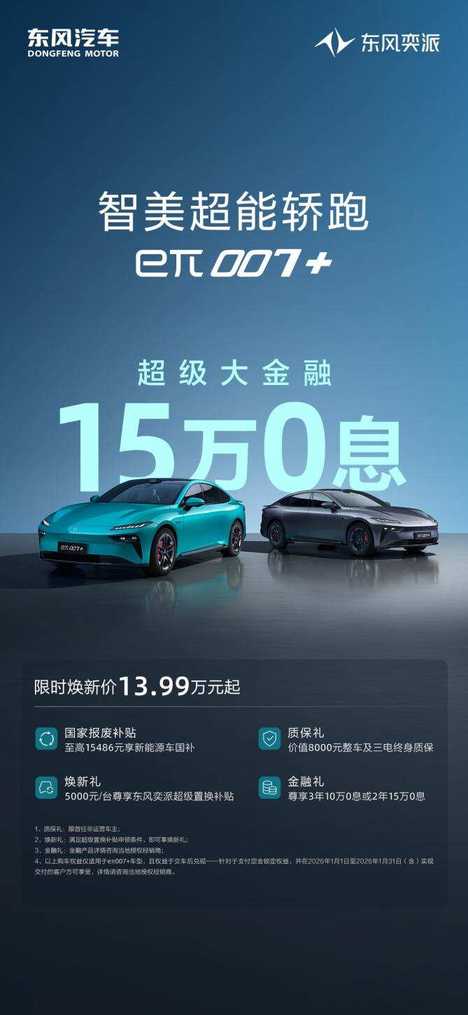 “智美超能轿跑”eπ007+在2025年展现出强劲的市场竞争力,其凭借14万级唯一搭载激光雷达的四驱轿跑硬核实力,成为年轻人的第一台“百万”级四驱轿跑,跻身众多年轻用户的价值首选。基于eπ007+打造的ETCR赛车更以“六连冠”的全胜战绩,强势赢得首届ETCR赛事年度总冠军,为品牌注入了浓厚的运动基因。2026年开局,eπ007+推出15万元0息的超大金融福利,限时焕新价13.99万元起,助力更多年轻人轻松拥有梦想座驾。与此同时,eπ007限时焕新价11.59万元起,购车限时享至高价值40000元购车权益,带来更加好玩好开的潮流体验。