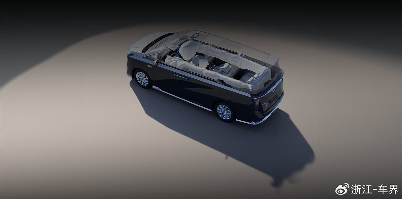 被动安全方面,采用“八纵十九横”车体结构,高强度钢占比高达85.6%,打造坚实的笼式铠甲车体。针对MPV第三排安全痛点,首创1.5米后风窗气囊,与两侧6.4米超长侧气帘,形成360°环抱式气囊矩阵,构筑刚柔并济的全向安全堡垒。