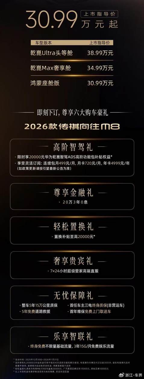 2025年12月30日,正值传祺M8上市八周年之际,2026款传祺向往M8感恩上市,新车上市指导价30.99万元起,限时补贴价仅28.99万元起。为回馈广大用户的长期信赖与支持,即日起下订即可尊享六大专属礼包:置换补贴至高20000元、限时享20000元华为乾崑智驾ADS高阶功能包补贴权益,以及20万3年0息金融礼等丰厚权益。