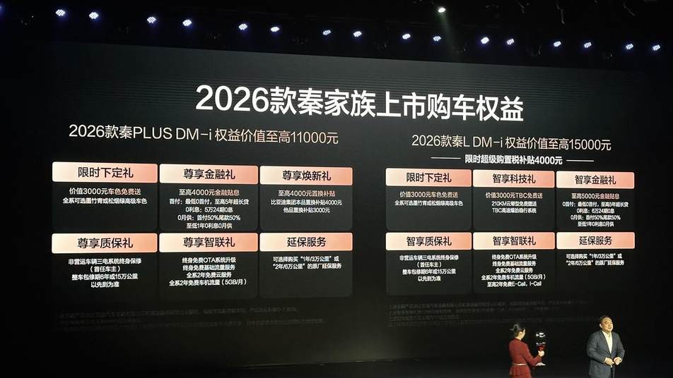 2026款秦L DM-i 210KM长续航版,共推出两款车型,售价区间11.68万元至12.68万元,限时超级优享价11.28万元起。2026款秦PLUS DM-i 210KM长续航版售价8.98至9.98万元。同时,两款车型均带来了多项上市权益。