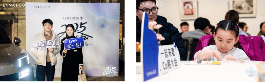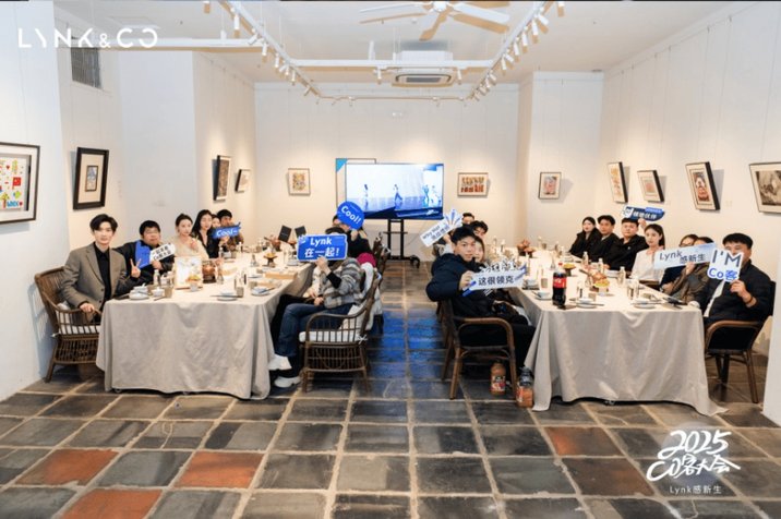 走进分会场,艺术展厅的墙面挂满画作,柔和的灯光裹着粉白雏菊的香气,长桌上“Lynk感新生”的桌牌、“I’M Co客”的立牌,让每一处细节都透着“专属感”。 提前布置好的茶歇台摆着松软的蛋糕、金黄的蛋挞,连青提都衬着精致的托盘;领克车型停在会场外,星芒灯效在夜色里铺开,车主们举着“这很领克”“Lynk在一起”的手牌合影,签名墙很快被不同笔迹的祝福填满——这里没有“活动现场”的疏离,更像一群老友的周末派对。