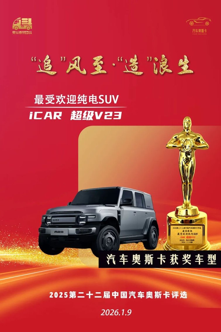 获奖理由:iCAR超级V23登顶2025年纯电方盒子销冠,全球粉丝超500万,凭借高颜值设计、极致性能与改装生态引领纯电SUV新风潮。