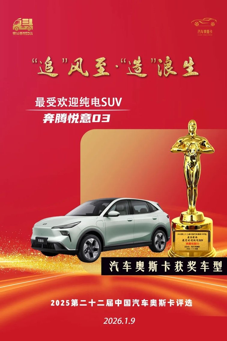 获奖理由:奔腾悦意03凭借大空间、大续航、大厂造三大核心优势,赢得数万家庭用户的青睐,成为家庭纯电出行品质首选。