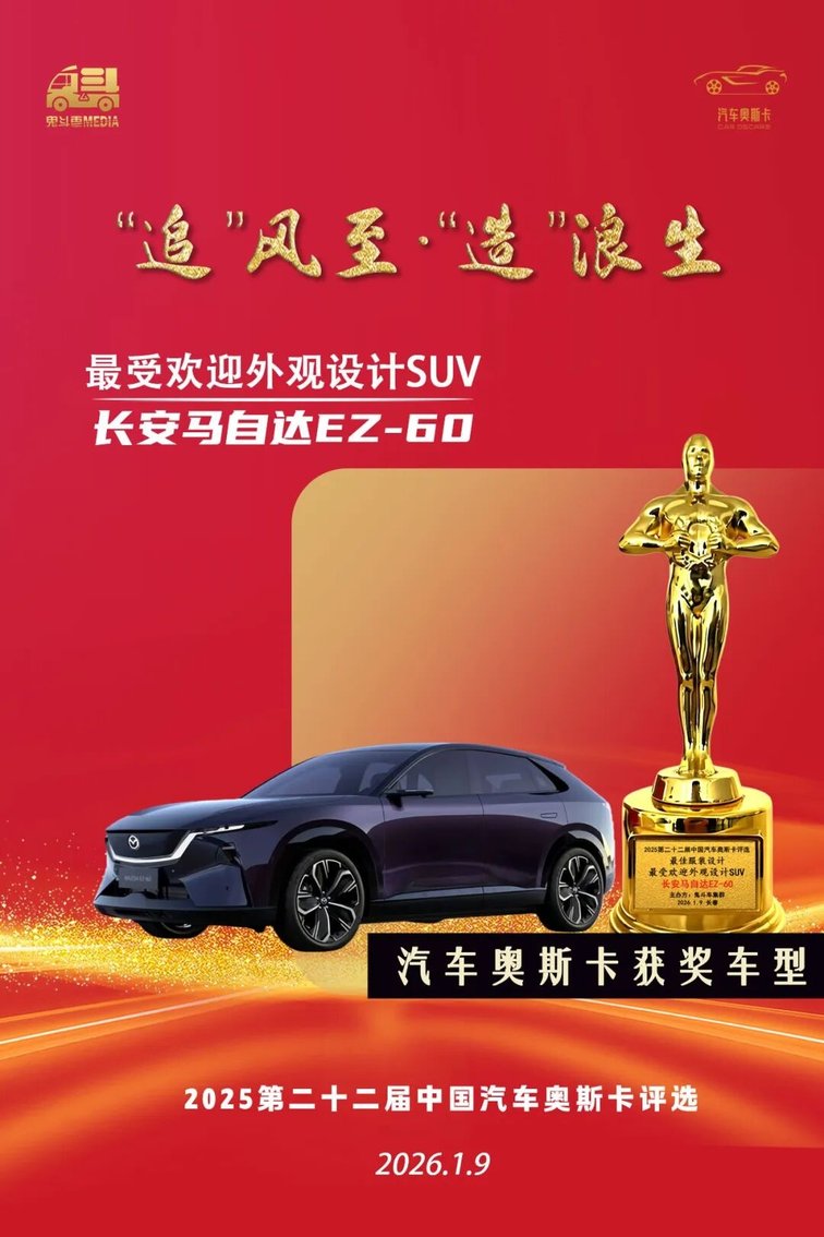 获奖理由:长安马自达EZ-60 承袭马自达「魂动」设计精髓,九风道设计勾勒出灵动的姿态,融东方美学与空气动力学于一体,颜值与实用兼备,连续多次斩获合资新能源中型SUV销量榜首,深得市场与用户高度认可。