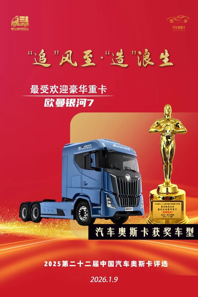 获奖理由:欧曼银河7以高端外观、智能座舱和卓越性能,重新定义重卡标准,成为万千卡友信赖之选。市场热度与用户口碑,正是其冠军实力的最好见证。