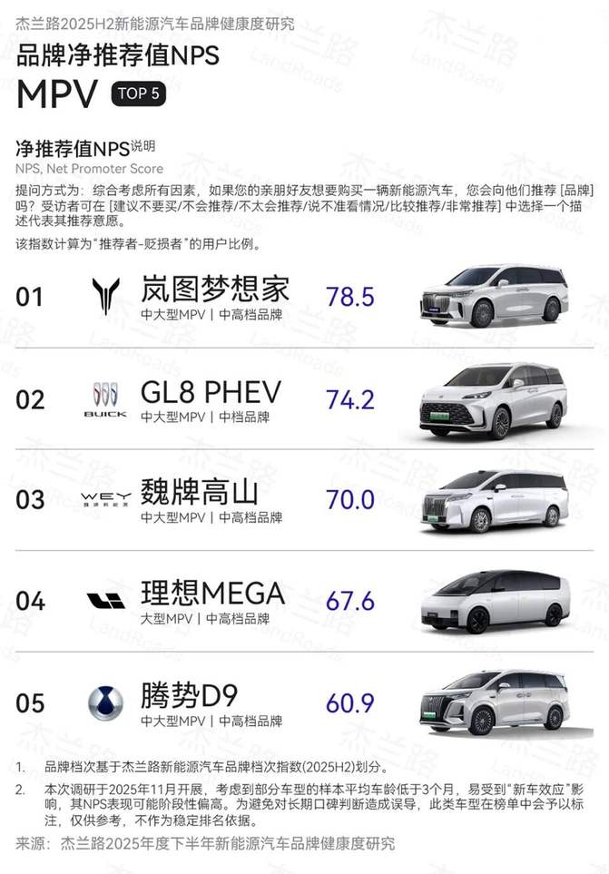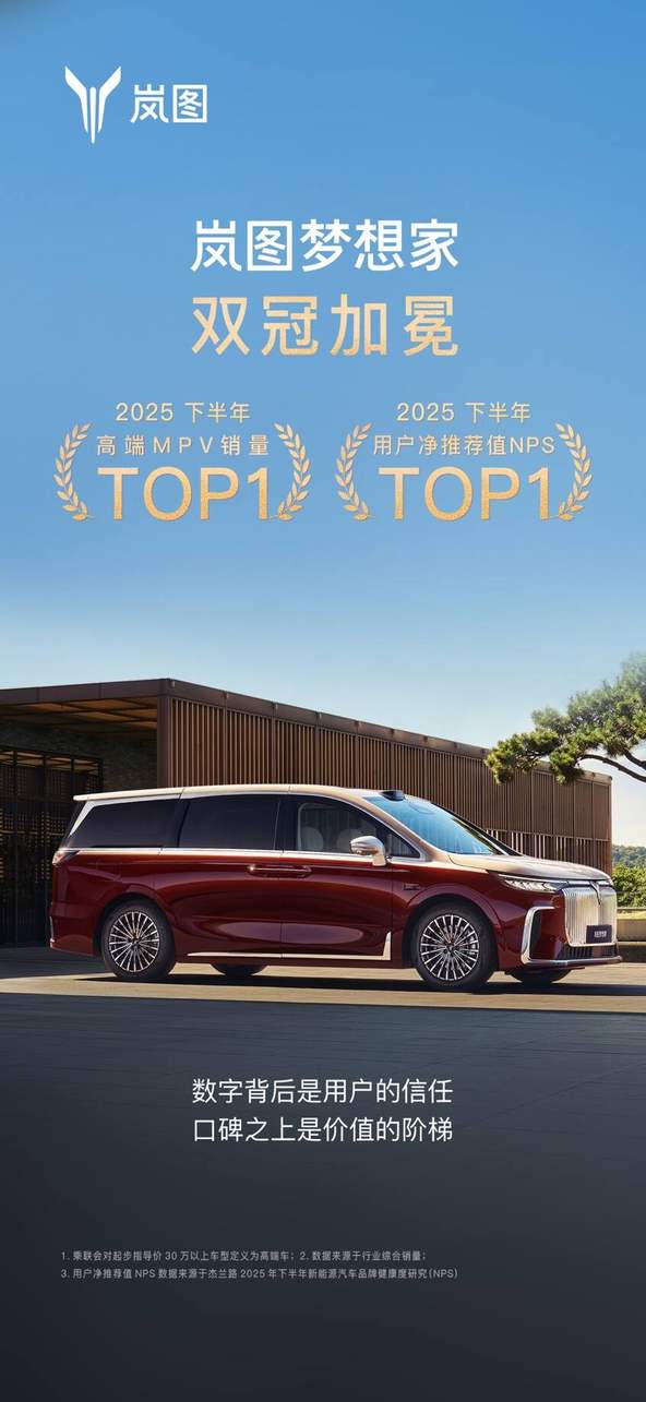 如今,中国高端 MPV 市场每卖出 3 台车,就有 1 台是岚图梦想家!这组数据的背后,是市场的用脚投票,是用户的真心推荐。2026 年,更多玩家即将入局,赛道只会更卷,但岚图梦想家已经立下了规矩:高端 MPV 的竞争,不再是品牌符号的比拼,而是产品力的硬碰硬,是用户体验的极致追求!