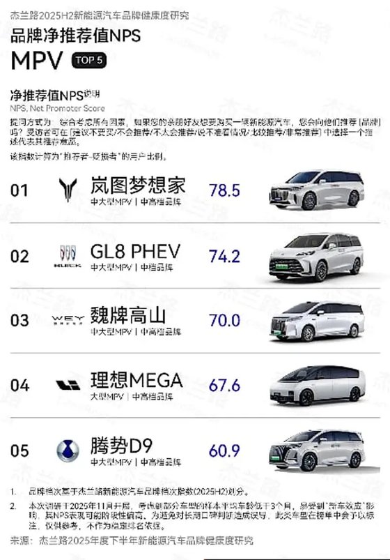 1月10日数据显示,岚图梦想家在2025年下半年销量为43191台,再次蝉联高端MPV第一,2025全年达到80248台,同比增长46%。另据杰兰路发布的《2025年度下半年新能源汽车品牌健康度研究(NPS篇)》,岚图梦想家在2025年下半年以78.5分的净推荐值(NPS)位居新能源MPV榜首。作为豪华旗舰MPV,岚图梦想家在2024年、2025年连续蝉联MPV用户净推荐值第一,成为销量与口碑的“双料冠军”,持续引领中国高端MPV。