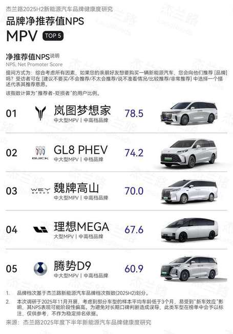 1月10日数据显示,岚图梦想家在2025年下半年销量为43191台,再次蝉联高端MPV第一,2025全年达到80248台,同比增长46%。另据杰兰路发布的《2025年度下半年新能源汽车品牌健康度研究(NPS篇)》,岚图梦想家在2025年下半年以78.5分的净推荐值(NPS)位居新能源MPV榜首。作为豪华旗舰MPV,岚图梦想家在2024年、2025年连续蝉联MPV用户净推荐值第一,成为销量与口碑的“双料冠军”,持续引领中国高端MPV。