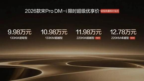 2026年1月10日,比亚迪正式宣布2026款宋Pro DM-i上新220km长续航版本,全系限时超级优享价9.98-12.78万元。
