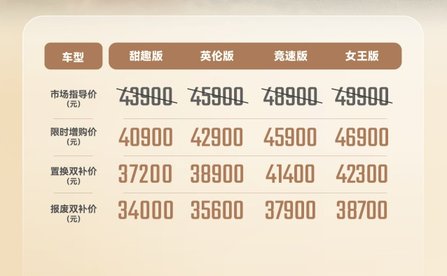 价格无疑是2026款QQ冰淇淋最有力的市场武器。奇瑞官方提供了两套价格体系,为不同消费者群体量身打造。女王版作为顶配车型定价4.99万元,其次是竞速版4.89万元,英伦版4.59万元,以及入门级甜趣版4.39万元。更具颠覆性的是奇瑞推出的“报废双补价”政策,购买女王版的消费者实际支付价仅为3.87万元,竞速版3.77万元,英伦版3.49万元,甜趣版3.40万元。