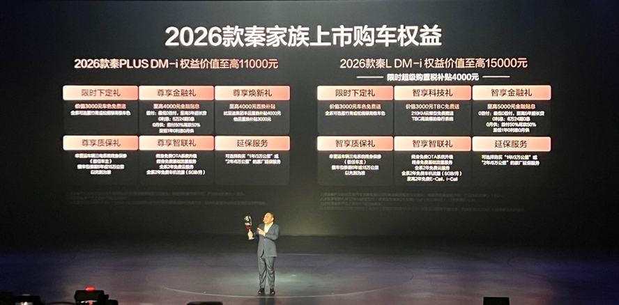 他所说的超大杯,是指的当晚上市的2026款秦L DM-i /2026款秦PLUS DM-i 210KM长续航版双车,纯电能跑210KM,确实在插混轿车领域算得上超长续航了。而中杯的价格则是:2026款秦L DM-i 210KM长续航版限时超级优享价11.28-12.28万元,2026款秦PLUS DM-i 210KM长续航版售价8.98-9.98万元,不仅如此,两款车型均带来了丰厚的上市权益礼。此外,2026款秦L DM-i和2026款秦PLUS DM-i也有128KM版本供用户选择。