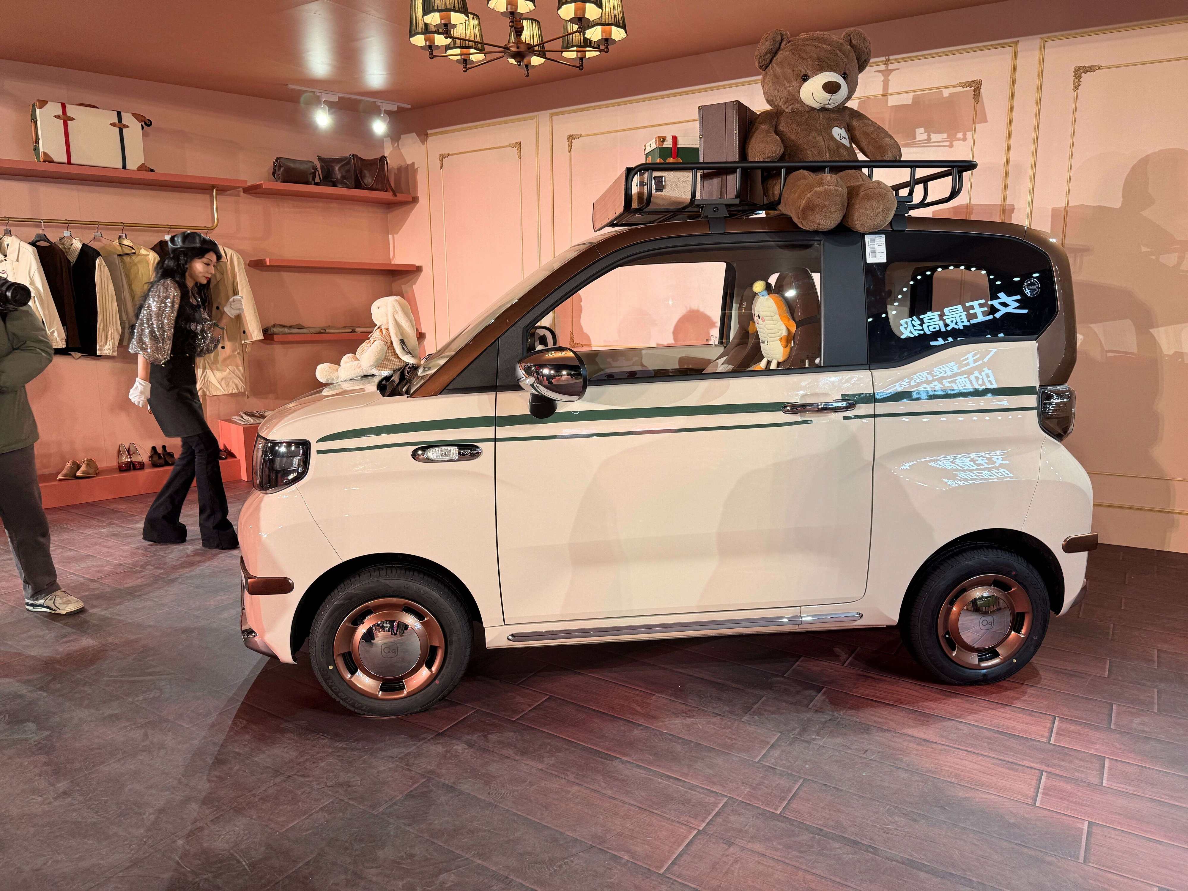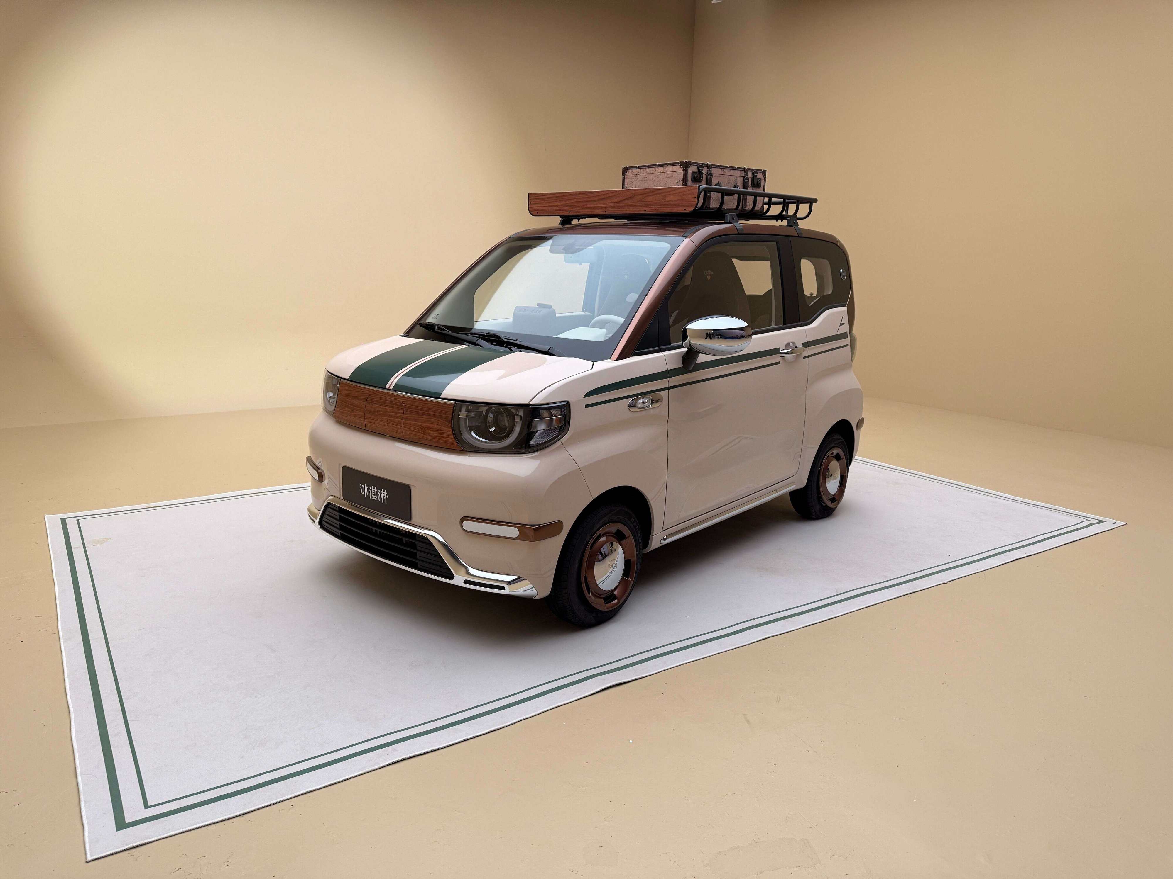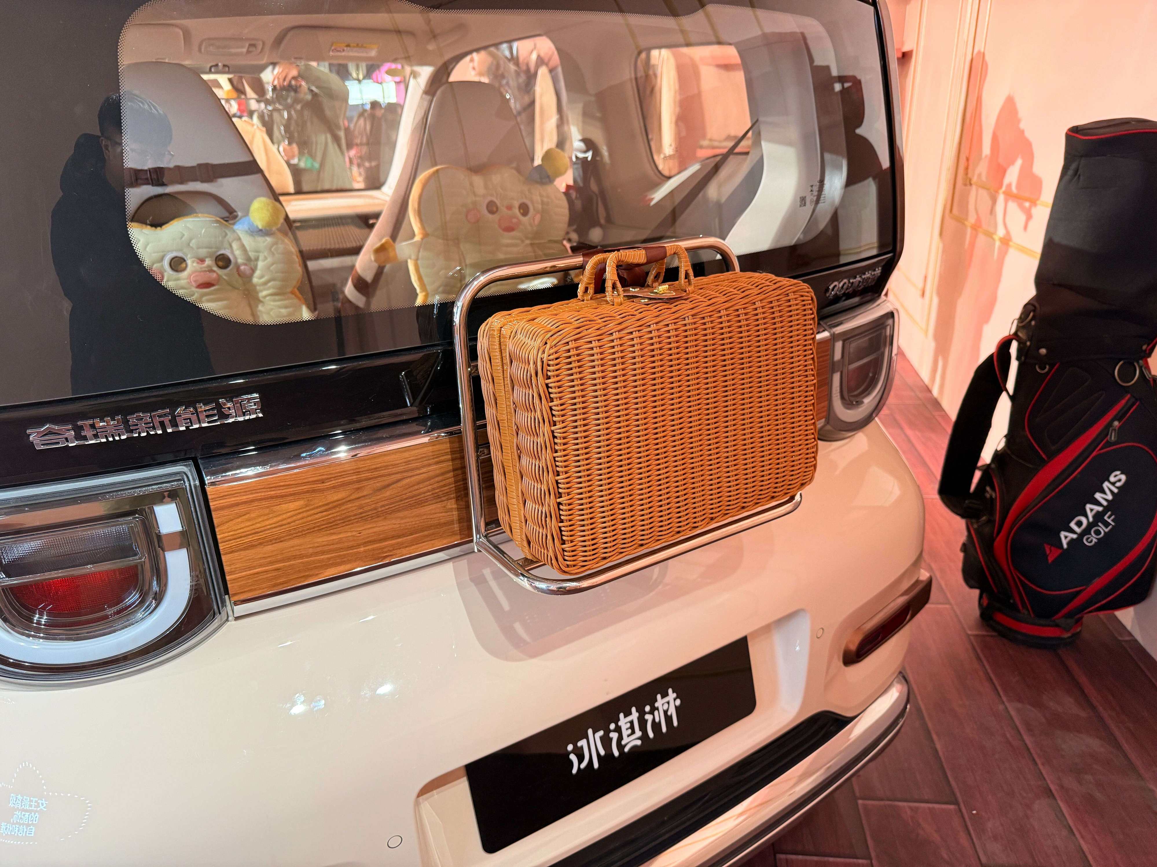 车顶的行李架承重30kg,对于微型车来说内部空间都不太充裕,行李架的存在就可以让大件行李有地儿放了,要是顶上几个皮箱子,那感觉就太对路了。除了车顶之外,车尾还配备了支架,承重2kg,展车上还配备了藤编小书包,容量为15L,这个搭配的感觉也很对,即使不放东西当做一个装饰都很好看。