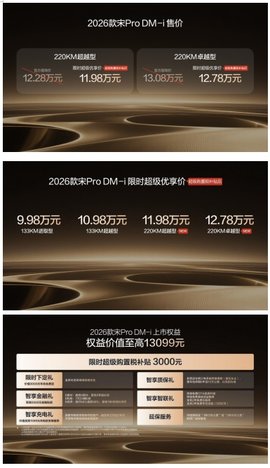 2026年1月10日,比亚迪正式宣布2026款宋Pro DM-i上新220km长续航版本,全系限时超级优享价9.98-12.78万元。