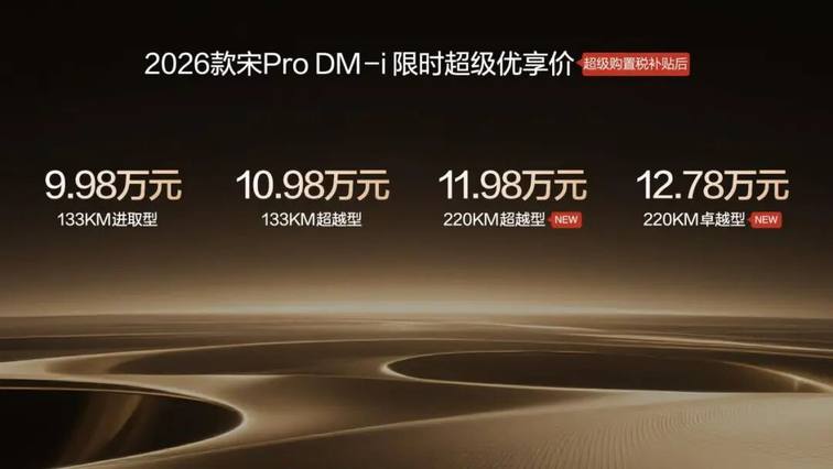 2026年1月10日,比亚迪正式宣布2026款宋Pro DM-i上新220km长续航版本,全系限时超级优享价9.98-12.78万元。