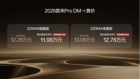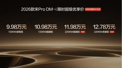 宋Pro已赢得超过百万家庭的信赖。此次2026款宋Pro DM-i以限时9.98-12.78万元的诚意价格,为消费者提供了更具价值的选择。它不仅是对产品线的有力补充,更是基于用户真实反馈的诚意升级。以更长的纯电续航、更智能便捷的科技配置、更体贴入微的舒适享受和更周全可靠的安全防护,生动诠释了一款优秀家用SUV应有的价值,陪伴更多家庭悦享每一段美好旅程。